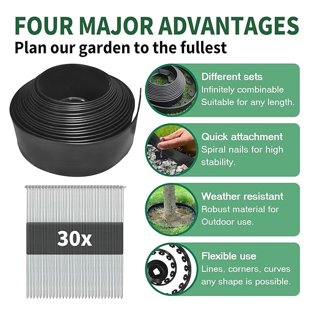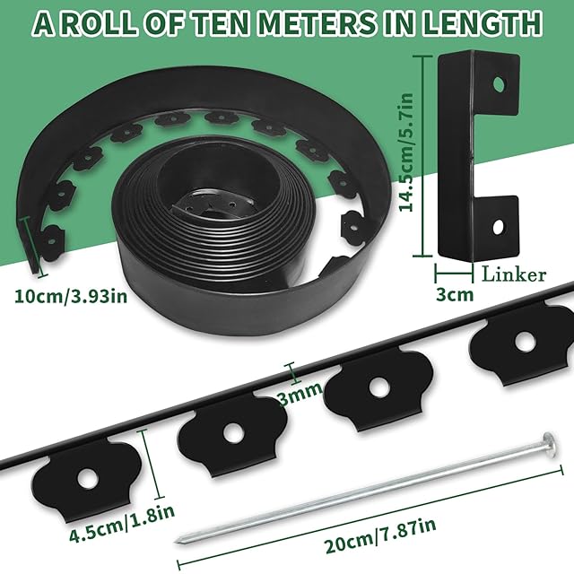 クリエイティブに - 当社の柔軟な芝生ガーデンエッジは、長くて太いサイズです。 長さ10mで、庭を計画するのに十分なスペースを提供し、厚さ3mmとL字型のデザインを組み合わせることで、芝生の形をより柔軟にすることができます。