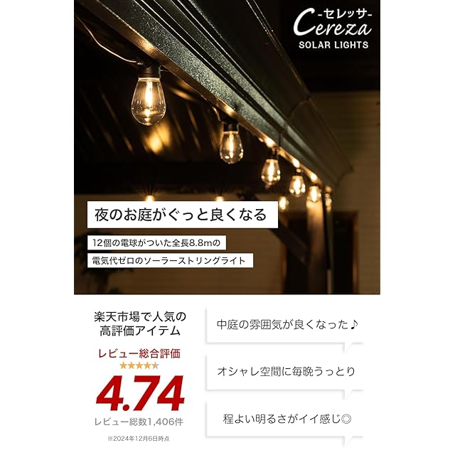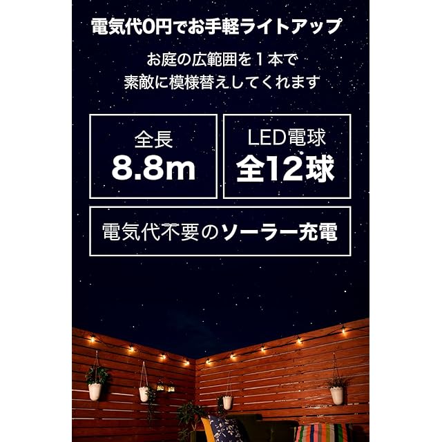 HAPPYJOINT セレッサ ソーラー ストリングライト 屋外 防水 IP55 電球色 調光 全長8.8m 割れない LED電球12個 S字フック付き