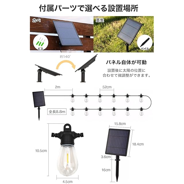 寸法重量:本体:全長8.8m パネル:横15.8cm×縦18.4cm / 電球:横4.5×縦10.5cm / パイル:16cm / 重量1.1kg