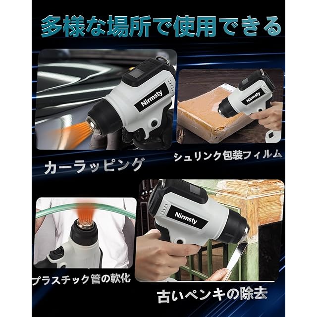 【付属品が充実&LEDライト搭載】このヒートガンは、曲面ノズル、平面ノズル、円形ノズルを含む多様なノズルが付属しており、用途に応じて柔軟に選択できます。収縮チューブ、塗料剥離、プラスチック成形、PVC加工、配管の解凍、自動車のメンテナンス、乾燥、電子機器の修理など、さまざまな分野で活躍します。さらに、この小型ヒートガンはわずか900グラムの軽量設計で、ラバー製のハンドルにより長時間の使用でも疲労感を軽減します。また、搭載されたLEDライトにより、暗い環境でも便利に使用できます。