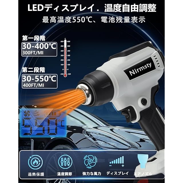 【2024版コードレスヒートガン&温度調整機能】これは最新型の小型ヒートガンで、温度調整機能とLCDディスプレイを搭載しています。また、2段階の風速と温度設定があります。第一段階は温度範囲30℃~400℃、風速300FT/min、第二段階は温度範囲30℃~550℃、風速400FT/minです。温度調整ボタンを押すことで、それぞれの設定温度範囲内で10℃単位で温度を調整できます。設定した温度は液晶画面に明確に表示され、電池残量も確認可能で、電池の突然の切断を防ぎます。