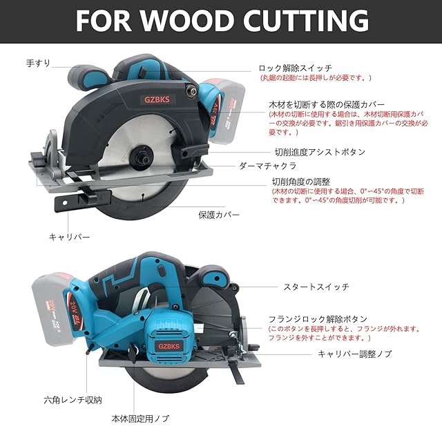 GZBKS 20V 7-1/2'' (190mm) コードレス丸鋸セット、調節可能な切断角度、木板切断、金属/木材垂直切断,マキタ18Vシリーズバッテリーに対応(電池は付属していません)