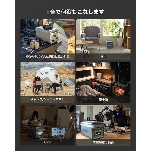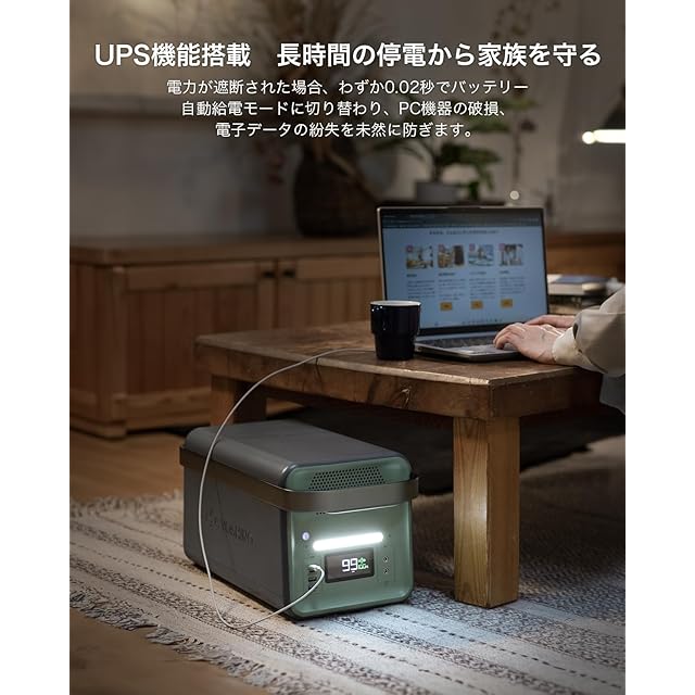 【専用アプリで遠隔操作・UPS機能搭載】YOSHINO(ヨシノ)専用アプリを使用して、バッテリー残量などの確認やリモートコントロールができます。高い視認性を誇るスマートスクリーンを搭載し、ポータブル電源の状況を一目で確認できます。さらに停電時、瞬時に電力を回復するUPS機能を搭載。電力が遮断されたり、安全レベルを超える変動があったりした場合、わずか0.02秒でバッテリー自動給電モードに切り替わり、PC機器の破損、電子データの紛失を未然に防ぎます。*注意:オフグリッド型UPSのため、本機能は0ms切り替えには対応していません。データサーバーやワークステーションなど、 0msUPSが必要な機器には接続しないでください。