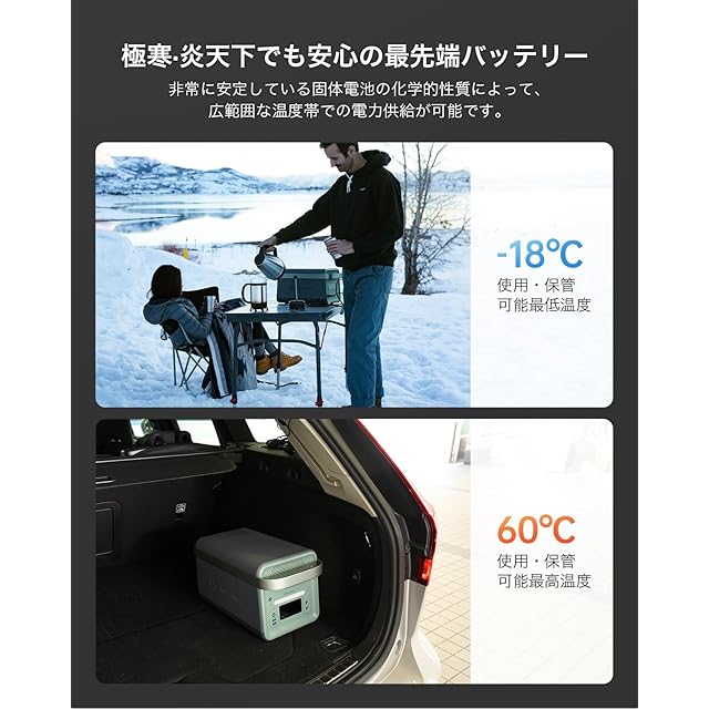 【固体電池を採用】海外高級電気自動車に使用される固体電池を採用。60℃程度の高温や-18℃程度の低温といった広い温度範囲で使用可能です。特に夏季の高温環境や車内での使用に最適です。猛暑の夏でも旅行やキャンプの際に頼りになる存在です。液体電解質を用いた従来の電池と比べて非常にエネルギー密度が高く、小型・軽量化を実現。バッテリーの充放電を繰り返し行える回数が、業界平均500回に対して、YOSHINO(ヨシノ)製電池は4000回でも容量の80%以上を保持し続けます。連続釘刺し試験、斧による耐久性テストも実証済み、爆発せず、明らかな発熱もなく、圧倒的な安全性を誇ります。