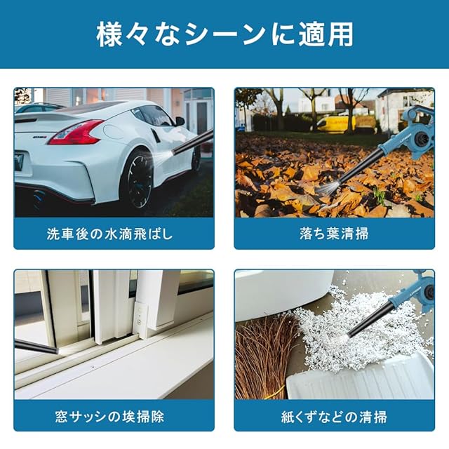 【様々な場面に適応】室内でペットの毛や窓サッシ・ベッドの底などの死角にたまるホコリや髪の毛などの掃除はもちろん、室外で庭の手入れに落ち葉や小枝の吹き飛ばしに、洗車を終えたあとの風乾にも使えます。様々なシーンで活躍し、家庭の日常的な掃除に最適。