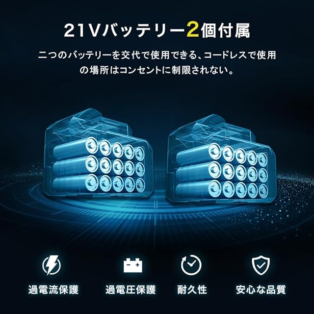 【大容量バッテリー2個搭載】21Vの大容量バッテリーを2つ搭載しており、室外で電源の確保ができない時でも使用できます。 2つのバッテリーの設計により、片方のバッテリーが切れてもすぐにもう片方のバッテリーに切り替えて作業を続けることができます。