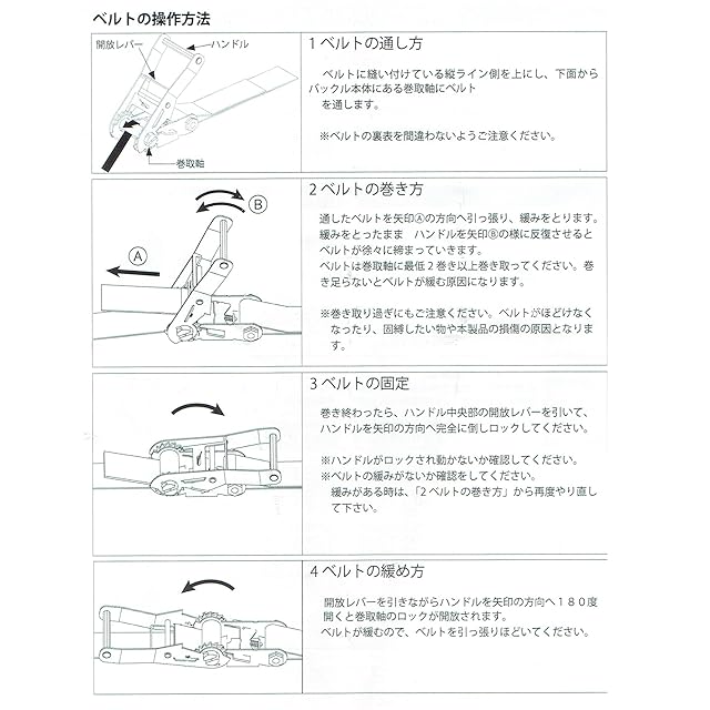 ハンドルと解放レバー間が100mmと通常タイプより35mm長く、厚手の手袋を付けたままでもベルトの巻き付け・固定・締め付け・緩めがスムーズに行えます。手の大きい方にもお勧めです。