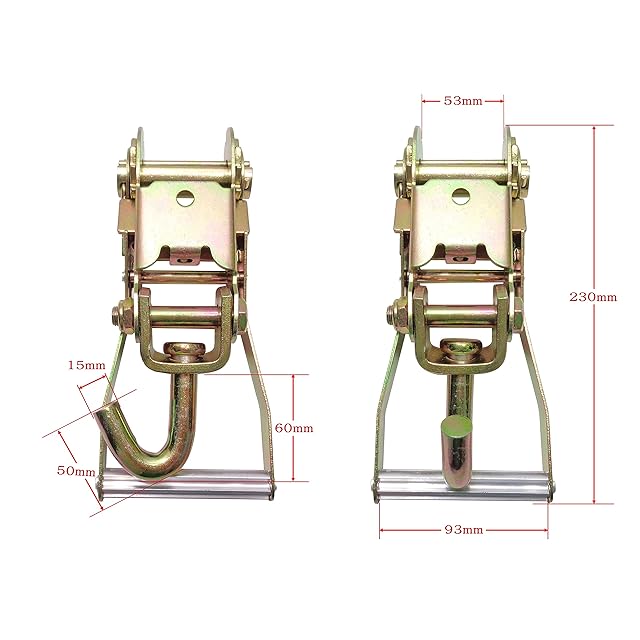 【商品仕様(ラチェット)】サイズ:230x93x53mm (2インチタイプ) | ハンドルと解放レバー間:100mm | 耐荷重:1.5t(3335LBS) | ワイドハンドル・ロングタイプ | フィンガーフック(スイベル式)