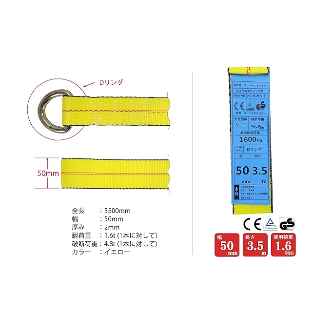 【商品仕様(ストラップベルト)】長さ:3500mm | 幅:50mm(2インチ) | 厚み:2mm(折返し部:5mm) | 耐荷重(1本に対して):1.6t(3525POUNDS) | カラー:イエロー | 安全係数:3(耐荷重×3=破断荷重) | 欧州CE規格+GS&TUVマーク取得