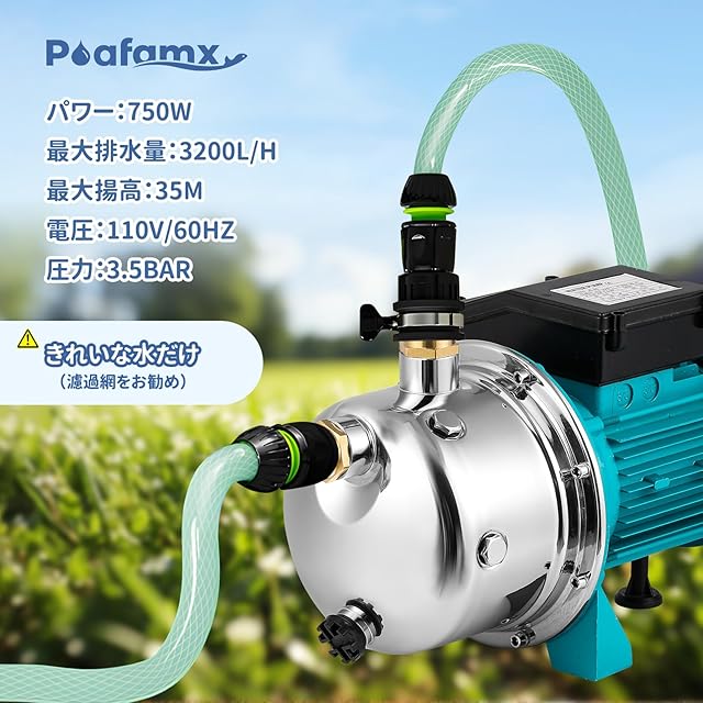 『強力な性能』:Poafamx 電動井戸ポンプの最大流量は3000 L/h、最大給水深は9 m、最大揚程は28 mで、強力な送水能力を備えています。また、効率的なモーターにより、低騒音で静かな運転と迅速な作業完了を実現します。