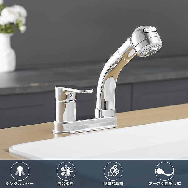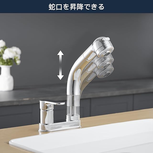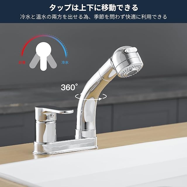 Kroias 洗面台蛇口 洗面水栓 ツーホール式 シングルレバー混合栓 2穴台付き ホース引き出し式 泡沫、シャワーが切り替え 360°回転 取付ホース クローム