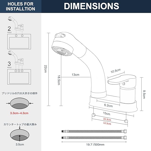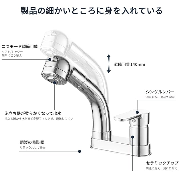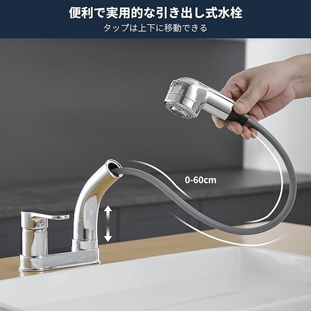 ホース引き出し式:洗面水栓のホースは最長60cm引き出し可能です,洗髪、洗面台をお掃除、場合はにはとても便利です。洗髪することも楽々で、蛇口に手が届かないお子様も最適です。