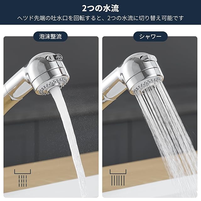 2つの水流モード:ヘッドの先端を回転すると、泡沫整流とシャワーを切り替えが可能。水を汲んだり集中して使いたい場合は、整流を切り替える。髪を洗う時はシャワーモードに切り替えます。