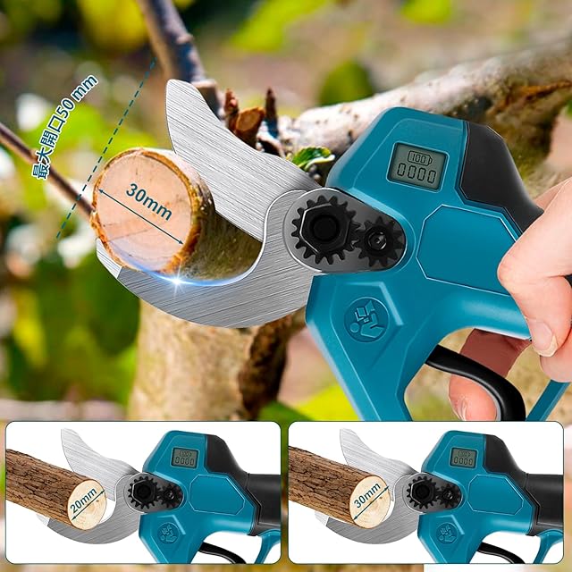 【SK5ブレード&刃のサイズ切り替え可能】このコードレス剪定ばさみは、SK5高炭素鋼から鍛造され、湾曲したデザインにより、木の枝を滑らかできれいに切断できます。刃のサイズは20mm、30mmの2つのモードがあり、初回起動時には30mmの大きな剪定径が設定され、電源ボタンを押すことで簡単にモードを切り替えることができます。(注:①引き金と電源ボタンを同時に押さないでください。②モード切替時には引き金を引かず、電源ボタンのみを押してください。)