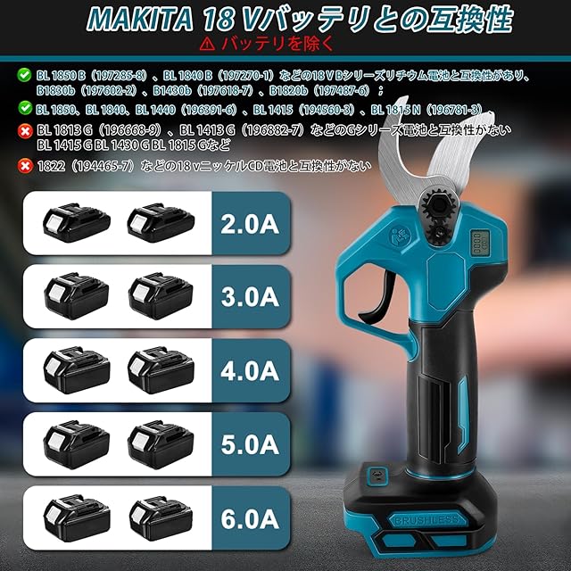 【マキタ18Vバッテリー対応】弊社の電動剪定バサミはBL1830 BL1840 BL1850 BL1850Bなどのマキタ18Vバッテリーと互換性があります。ご注意:バッテリーと充電器は別売りです。