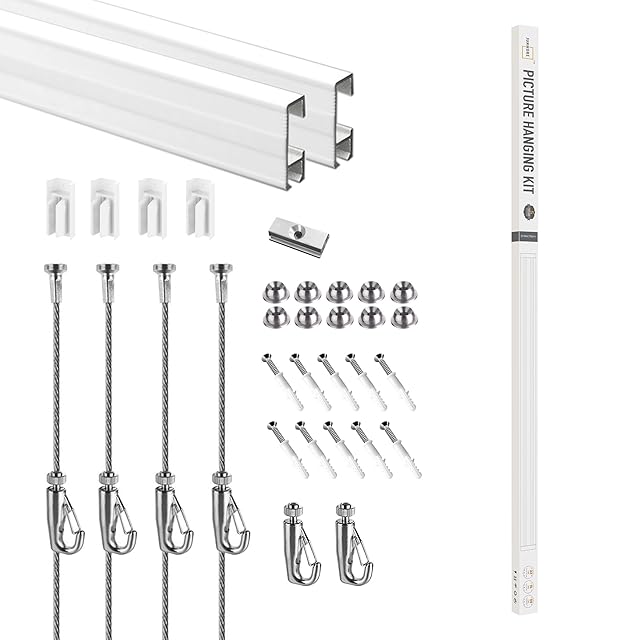 JUNMORE ピクチャーレールセット 白色レール59インチ×2本・スチールワイヤー×4本・フック×6個・エンドキャップ×4個・取付金具付き 壁掛け用絵画ハンギングシステム