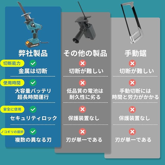 様々な場合に適用:ニーズに応じ、ブレードを選択でき、様々な用途に対応できます。DIYや庭木の剪定、家具の解体 、粗大ゴミ解体、竹林整備、金属切断、薪作りなどいろんな分野に大活躍!