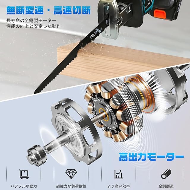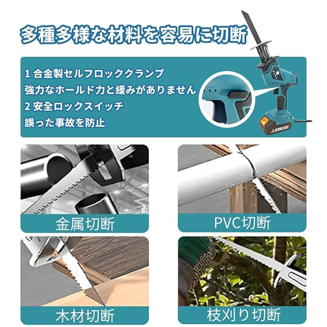 強力な切断能力&取り外し可能な刃:電動のこぎりは,強力なモーター搭載、高速切断を実現!往復ストローク幅は15mm、切断速度は毎分最大2400カットで、正確な切断作業から大量の切断作業まで簡単に対応できます。刃は手軽に取り外せるため、お手入れも簡単です。本製品には、コードレス往復鋸本体、大容量バッテリー2個、充電器1個、替え刃4本、収納ケース1個、日本語の取扱説明書1冊が含まれています。