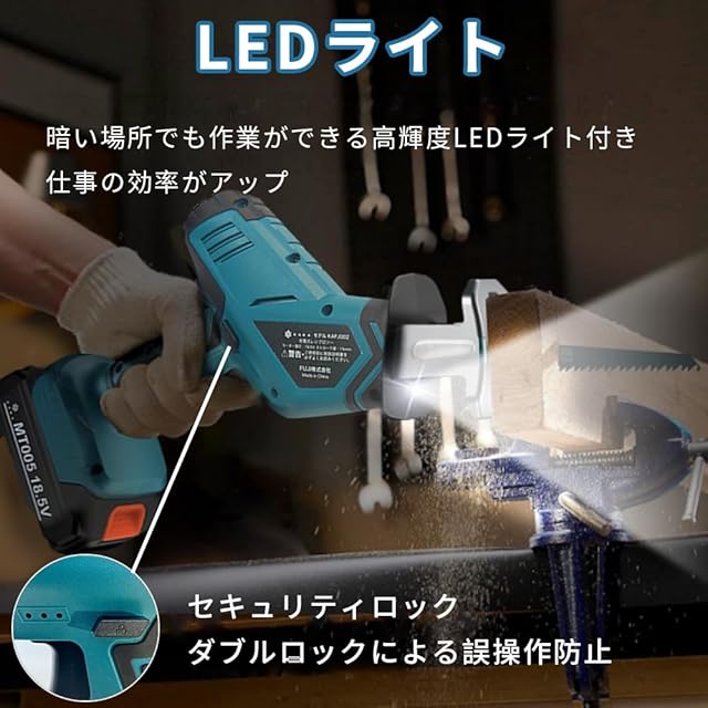 LED付き&安全ロックボタン:LEDライトが鋸前端に内蔵され、暗いところでも楽に操作充電式レシプロソーです。レシプロソーはお客様の使用体験を配慮して、安全ロックボタンと滑り止めのハンドルを採用しています。 スイッチ引金は、安全ロックボタンを押さなければ引けない、スイッチ引金を離すと動作停止します。ダブルロックで誤操作防止します。人間工学に基づいた滑り止めハンドルは手にフィットし、非常に快適で、振動や滑りを効果的に低減し、疲労を軽減し、作業の快適さを向上させます。