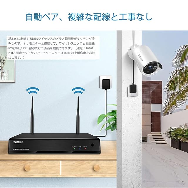 【ワイヤレス接続・操作簡単】 ワイヤレス防犯カメラなので、設置簡単、配線工事が不要です。IPカメラとレコーダーに電源を入れると、自動にコードをマッチングし、ローカル観覧する場合、インタネット要らず監視や再生が可能です。遠隔観覧する場合、LANケーブルでNVRとホームルータを接続する必要です。