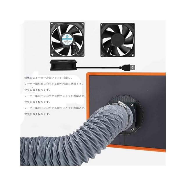 【換気システム付き】キットの換気システムは、換気口、8025ファン、9.9フィートの換気ホースで構成されています。 ファンには利便性を高める5V USBポートが付いています。 保護カバー:この保護カバーは、レーザーの偏向をブロックし、切断/彫刻による煙や臭いを軽減し、火、ほこり、煙、注文、ノイズから保護します。
