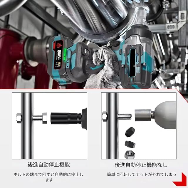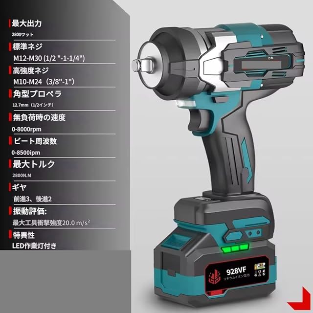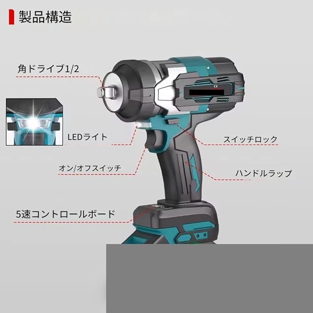 -LED作業灯付き。 18Vマキタ互換性バッテリーに適合 -適合:BL1830 BL1850 BL1840 BL1840B BL1850B。 -互換性なし:DC18WA BL1813G BL1413Gバッテリー。 注意: 手作業による計測のため、1~2cmの誤差が生じる場合があります。 表示の違いにより、色が異なる場合がありますので、ご了承ください。 パッケージに含まれるもの: ①バッテリーなし: レンチ x 1 アクセサリー x 2 ボックス x 1