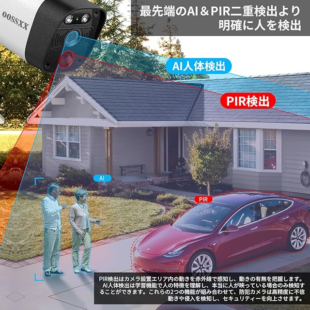 {PIR & 二重検出} 高度な認識アルゴリズムと赤外線検出器の助けを借りて、OOSSXXは異常なアクションが発生するとリアルタイムで通知を送信します。双方向検出は葉、雲、動物や昆虫を検出しません、従来のモーション検知より性能が大幅に向上!