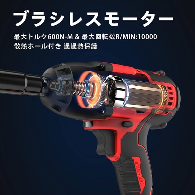 【純銅ブラシレスモーター】:ブラシレスモーター搭載で高効率を実現したインパクトスパナ。最大トルクは600N·mで、過電流保護、過電圧保護、過熱保護、充放電保護など安全性・耐久性にも配慮しています。車の修理、タイヤ交換、ホームメンテナンス、ナットの締め付けやボルトの緩めなどに最適です。 【リバースオートストップモード&3段調整】無段階速度変更機能で手元の速
