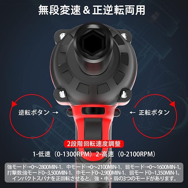 【リバースオートストップモード&3段調整】無段階速度変更機能で手元の速度を微調整できます。強モード→0~2800min-1、中モード→0~2100min-1、弱モード→0~1600min-1。 ブラシレスモーターはコアレス構造で、高い制御性、高効率、メンテナンスフリー、ノンスパーキング、安定した増速、長寿命などを実現しました。また、スイッチにかける力を調整することで回転の微調整ができる無段変速機能を搭載しています。