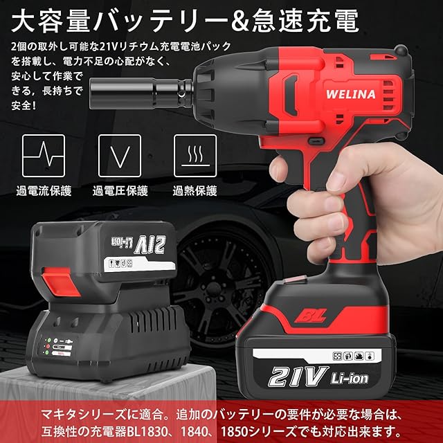 [ウェリナ] 電動インパクトレンチ インパクトレンチ タイヤ交換 インパクト 電動レンチ コードレス 600N·M 自動停止モード ブラシレスモーター搭載 無負荷回転最大数:2800r/min オートストップ機能 正逆転両用 ワークライト付き バッテリー2個 付属品 車 自動車の修理 無段変速 過熱保護機能 急速充電器・収納バック 日本語説明書 赤