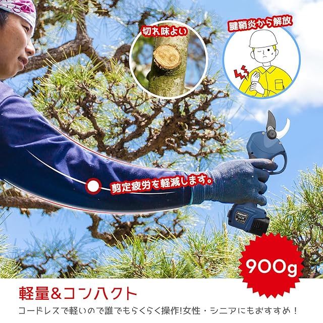 【軽量&コンパクト】この電動剪定バサミは人間工学に基づいており、わずか900gの軽量設計で持ちやすいです。コードレスなので、屋外作業でも便利です。連続作業にも適しています。女性や高齢者にも優しく、長時間の作業でも疲れにくいです。