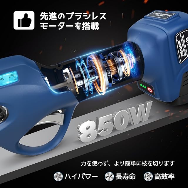 【切れ味抜群】電動ハサミの刃はSK5鋼製で、切れ味が優れ、切断面がきれいで植木の健康を守ることができます。850Wのブラシレスモーターを搭載しており、瞬時に28mmまでの生木を0.3秒で切断することができます。お客様のニーズに合わせて、開口幅を28mmと20mmの間で切り替えることができます。
