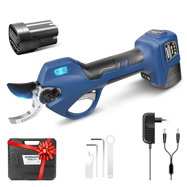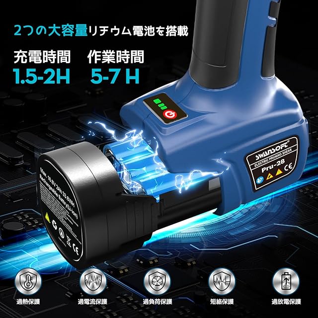 【引金連動、軽量 】Swansoft けが防止機能 28mm 電動剪定バサミ 0.3秒で瞬時切断 コードレス電動はさみ トリガー連動機能付き 16.8V 2Ahリチウム電池2個付き 切断回数と残量表示ディスプレー 2段階開き角度調節可 剪定バサミ 電動 片手操作 庭木 果樹用 園芸用具 日本語取扱説明書付き(品番 Pru28)
