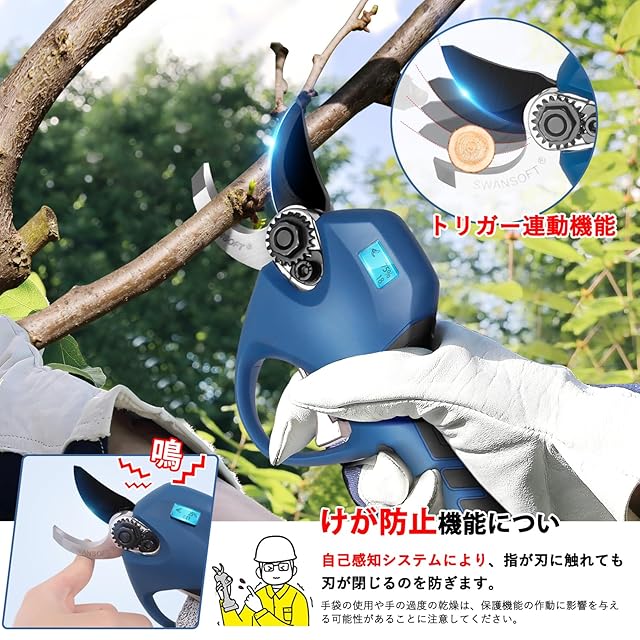 【トリガー連動機能】トリガーの動きに合わせて刃物が追従し、より安全かつ繊細な剪定作業が実現できます。Swansoft電動剪定ハサミは庭木の剪定、造園作業、伐採や枝の処理において、優れた作業能力を発揮し、欠かせない存在となります。