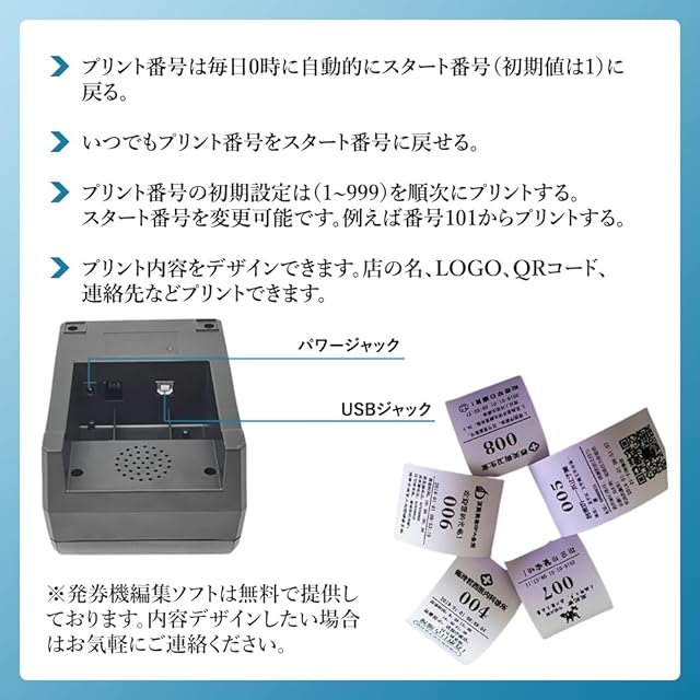 ※「機能」: 順番発券。一度に1枚ずつ プリントする。同じ番号を2つ以上連続してプリントすることができます(編集ソフトでの設定が必要)。発券の番号は、いつでもスタート番号(初期値:001)にリセットできます。翌日、発券機の番号は自動的に001にリセットされます(この機能はオフにできる)。スタート番号を設定することができます。