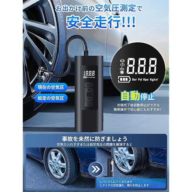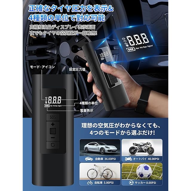 【操作は簡単&5つのモード&4種単位対応&自動停止】車用空気入れは圧力測定とタイヤ空気入れ機能が一体となったエアポンプを使用してタイヤを空気入れすることがより簡単になります:タイヤの適正空気圧を確認後、 適正空気圧を設定 → 自動で空気を充填 → 自動で充填停止。本電動空気入れは4つのおすすめモードと一つのメモリーモードがあります。推薦モードは車、バイク、自転車、ボールに対応し、初期値が設定されています。このエアコンプレッサーは切替ボタンを押すと圧力の単位を「PSI」「BAR」「KPA」「kg/cm²」の4種類から選択できます。本自転車空気入れは手袋をしたままでも操作できる物理ボタンを採用しており、タイヤの圧力を正確に測定し、設定圧力に達すると自動的に停止します。タイヤの測定ミスによる損傷を減らし、タイヤの寿命を延ばし、外出がよりスムーズに!