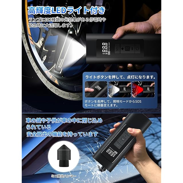 【LCDデジタル表示&LEDライト】車用空気入れは見やすい大画面LCDディスプレイには空気圧の単位、空気入れモード、バッテリー残量、実際の圧力値、セットした空気圧や空気圧のリアルタイム数値などの情報で表示され、タイヤ圧力の状態を簡単に読み取り、観察することができます。夜間でも数字が読みやすく、安全な充填を確保します。夜間の作業でも安心して使えるLEDライト付きで、暗闇でもタイヤ充填や作業を安全に行える 電動空気入れ となり、応急時の照明機能を備え、緊急時や暗い場所での使用に便利です。自宅のガレージから外出先・アウトドアなどの場所を選ばず使用できます。