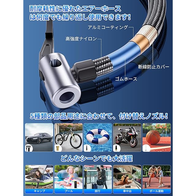 【商品内容】電動空気入れ本体、エアーホース(米式バルブ)、英式バルブ/仏式バル(二つの用途がある)、ボールニードル、浮き輪ノズル、充電ケーブル、収納袋、日本語説明書。【品質保證】万が一商品は初期不良や故障などがありましたら、また使用中に質問がある場合は、いつでもお気軽にお問い合わせください。ご満足できるまで力を尽くしています。には24時間以内に対応できますので、ご安心ください。