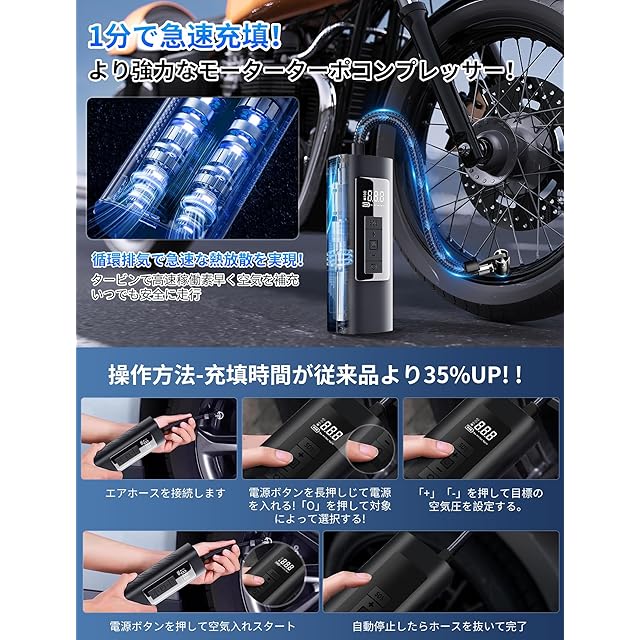 【多様な対応性&軽量&携帯便利】休日の外出ラッシュ時、自動車は渋滞しやすい区間で、緊急時に問題が発生し、車にタイヤの空気ポンプを装備することが重要です!タイヤ空気圧が低下して走行不能になった時に大活躍! 電動エアーポンプで効率的で高速な空気注入を体験してください。 15000R/MINで動作する高速モーターと、34L/分の高速エアフローと150 PSIの最大圧力を提供する強力な19シリンダーエアポンプを装備しています。本製品には4種類のノズルが付属しており、様々な対象に使用することができます。さまざまなボール、浮き輪、自転車、バイクから自動車まで、このエアコンプレッサーを使用して空気を入れることができ、非常に広範な実用性を備えている。本体のサイズ:170*69*50mm。電動空気入れの本体は小型軽量デザイン、重量598gには持ち歩いても車に積んでもとても便利です。リュックサック/自動車のトランクに電動空気を入れるのは全く問題ありません!