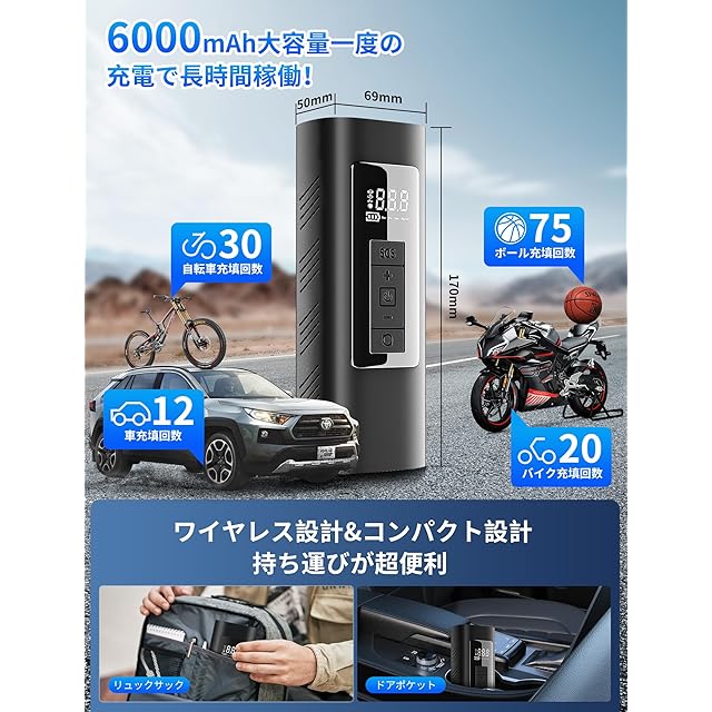 【Type-C充電式&大容量バッテリー&コードレス】この電動空気入れは6000mAh大容量バッテリーを搭載し、空気入れ 電動13回の自動車充填、21回のバイク充填、35回の自転車充填、83回のボール充填が可能で、あらゆるシーンで安心して使える エアコンプレッサー ます。電源が不要なため、持ち運びやすく、旅行や緊急時にも最適な 自転車 空気入れ です。Type-C充電ポートを採用し、充電ケーブルが付いており、強力なフィット性を備えています。下部にtype-c充電口と5V/2A USB出力口があり、お客様が緊急時に車で製品を充電することができ、充電困難な問題を回避し、タイムリーに使用することができます。コードレスと充電式のタイプはどこでも使え、電源を確保しづらい屋外でも活躍となります。自転車に乗るときはリュックから取り出してタイヤに空気を入れることができます!