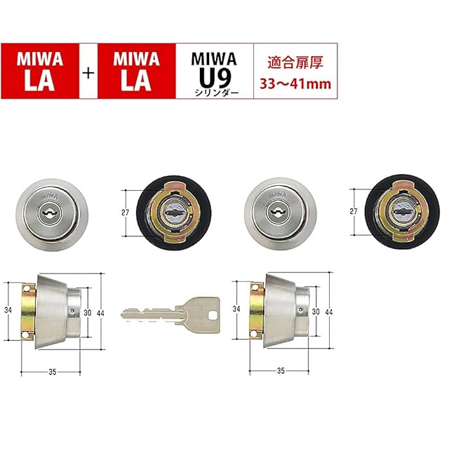 MIWA(美和ロック) U9シリンダー LAタイプ 鍵 交換 取替え 2個同一セット MCY-143 LA/LAMA/DAステンレスへヤーライン色(ST)33~41mm