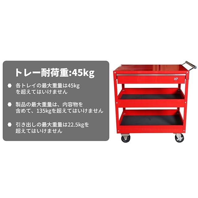 【本体最大耐荷重】:135kg(各トレイの耐荷重:約45kg、引き出しの最大重量:約22.5kg)、本体重量:19.9kg