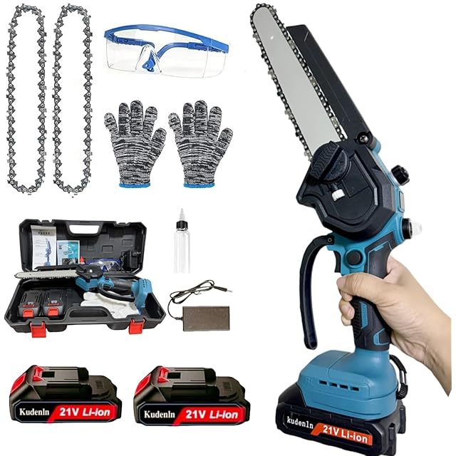 【付属品豊富、組み立簡単】 ミニチェーンソーには、8インチチェーンソー×1、21Vバッテリー×2、ソーチェーン×2、認定充電器×1、ドライバー×1、ゴーグル×1、保護手袋×1、日本語取扱説明書×1、収納ボックス×1。