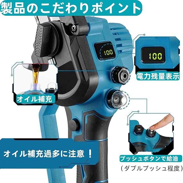【自己潤滑式チェンソー】チェーンの固着を防ぐ「給油システム」を搭載。 オイルタンク(別売り)にオイルを注ぐだけでいつでもチェーンに注油できます。 使用時の注油の手間が省けます。 チェーンには十分な注油を行ってください。 これにより、ガイドバーとチェーンの寿命が最大化され、よりスムーズな切断が可能になります。