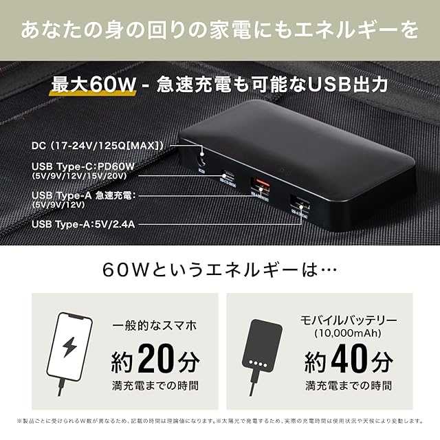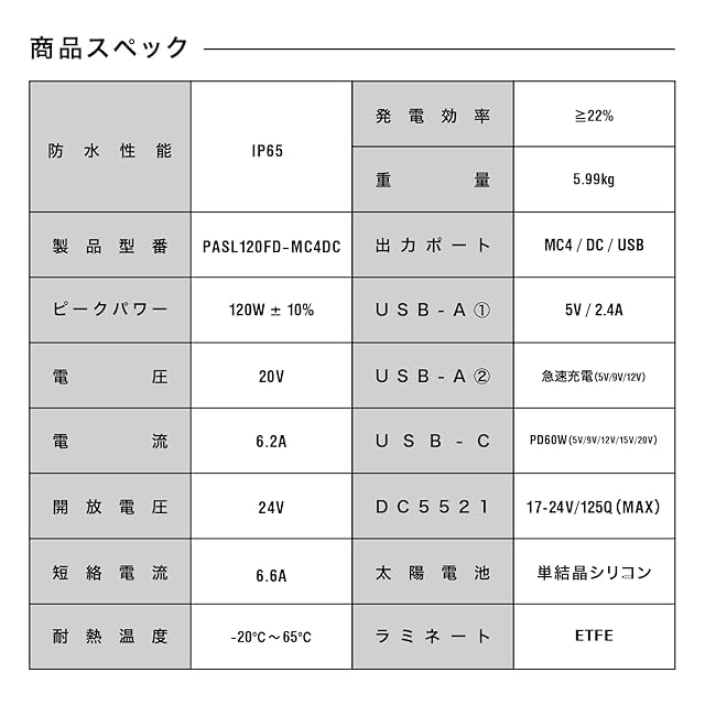 【注意事項】パネル面に保護フィルムが貼付されている場合は、剥がして使用ください(保護フィルムのあり/なしはロットによって異なります)。また、パネルの一部を隠した状態では上手く発電できませんので、全面を太陽光に当てて使用してください。雨や湿気の多い場所で本製品を使用または保管しないでください。濡れた手でMC4端子や出力端子に触れないでください。MC4端子に金属物を接触させないでください。Xperia、HUAWEIは独自規格のため急速充電できない場合があります。実際の発電量は太陽光の強さ・太陽に対する向きにより変動するため、理論値より少なくなる場合があります。