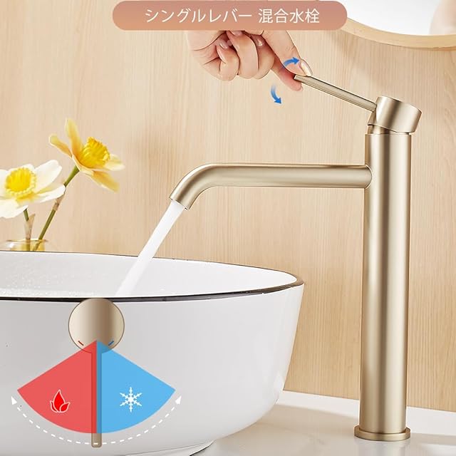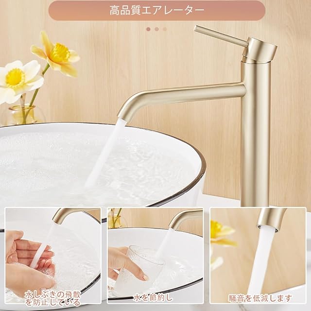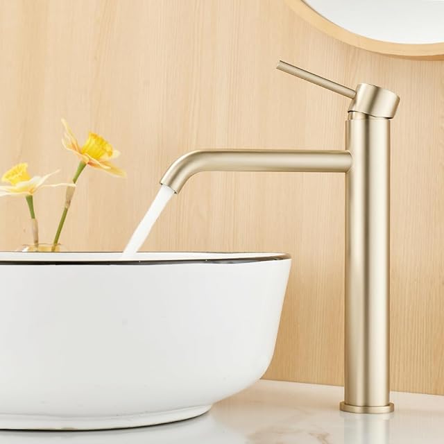 モダンデザイン: この高さ28cmのバスルーム洗面器用混合水栓は、モダンさとファッション性に溢れ、台上洗面器に最適です。頑丈で耐久性のあるステンレス鋼で作られており、表面はヘアラインゴールド仕上げが施されています。これにより、どのようなバスルームにも華やかなアクセントを加えます