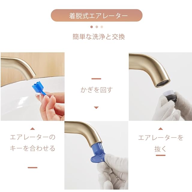 エレガントな表面仕上げ: ヘアラインゴールド加工は強力な表面保護を実現し、蛇口を腐食・変色・傷さえも防ぐ高い耐性を備えさせます。温かみのある豪華な金色の輝きが、バスルームに高貴で独特な雰囲気を醸し出します