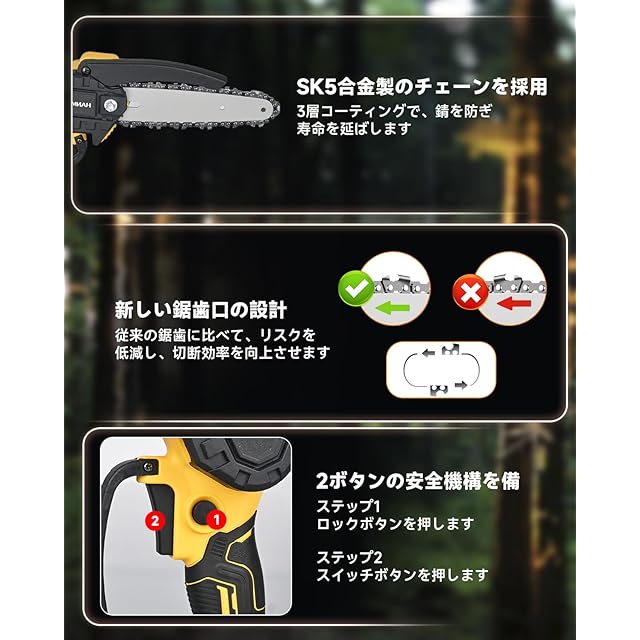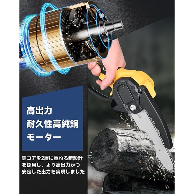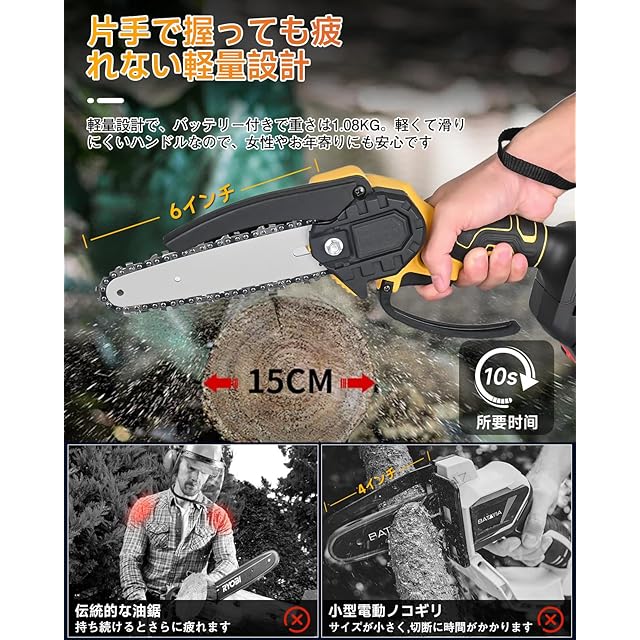 【高効率な切断】この電動ノコギリは切断作業を効率的に行うもので、モーターは最大25000RPM/minで強力なパワーを提供します。小さな枝を切ったり、大きな木材を処理したり、さまざまな作業に対応できます。直径15センチの木材を切断することができ、鋭いチェーンと熱処理された刃が滑らかで正確な切断プロセスを保証します。短時間で大量の作業ができるだけでなく、ノコギリの優れた性能が発揮され、作業効率がアップします。