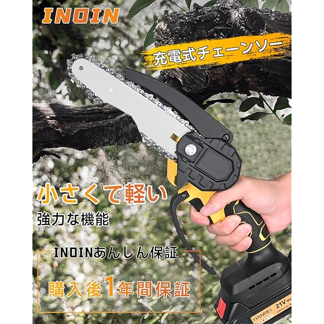 チェーンソー 充電式 電動ノコギリ【鈴木造園会社監修】 Inoin 電動チェーンソー 残量表示 250000RPM/min ハンディチェーンソー コードレス ポータブル 4000mAhバッテリ一*2 強力ブラシレスモーター 軽量 片手で使う 充電式チェーンソー 防風ゴーグルと手袋が付属 木工切断/枝切り/庭木の剪定/竹を切る/園芸用品 日本語取扱説明書 オイル不要 (Yellow)