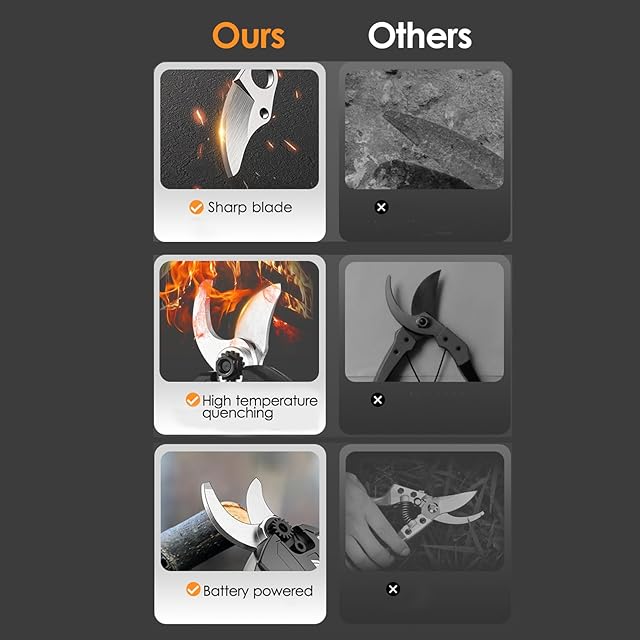 【高効率ブラシレスモーター】 21Vプロフェッショナルコードレス電動剪定ハサミは、強力なブラシレスモーターを搭載しています。この電動剪定ハサミの進化したテクノロジーにより、実行時間が通常のモーターよりも50%長く、剪定効率が30%向上します。耐久性も向上し、従来のブラシモーターよりも3~5倍も長寿命で、メンテナンスコストが大幅に節約されます。